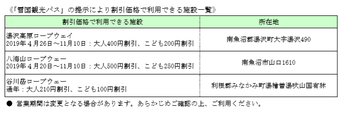 「雪国観光パス」をご提示いただくと、エリア内一部施設が割引でご利用になれます。 割引の適用施設は以下の通りです。