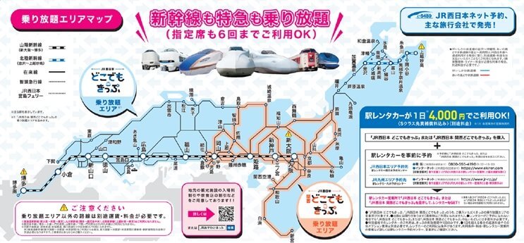 - 発売場所はJR西日本ネット予約サイト「e5489」と、JR西日本管内・福岡県内・佐賀県内の主要旅行会社です。なお、「どこでもきっぷ」の2日間用は旅行会社のみの発売です。