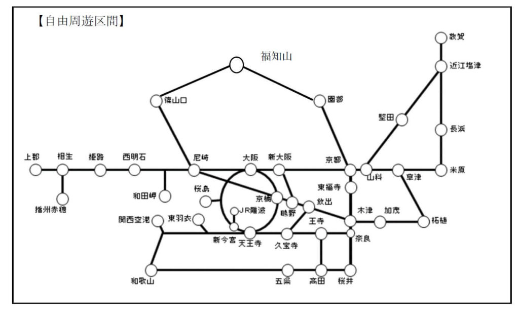 今回の「関西近郊 休日ぶらり旅きっぷ」では今まで発売されていた関西1デイパスのフリーエリアに加え園部~福知山~篠山口もエリアに加わっています。